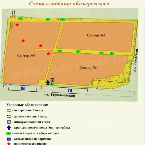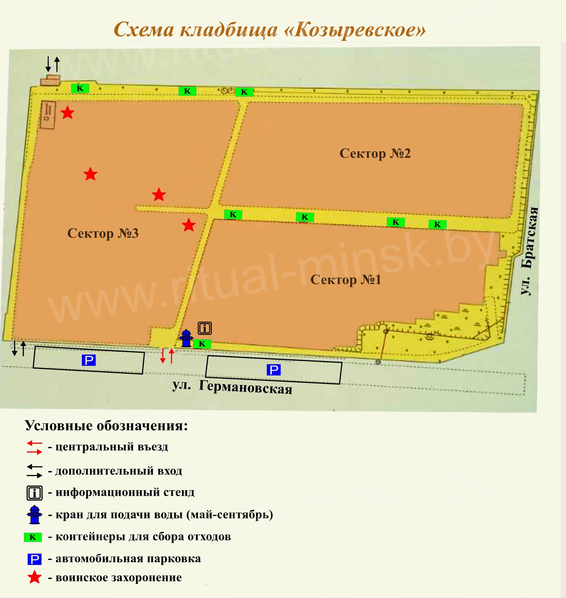 По всем вопросам, связанным с проведением благоустройства на участках для захоронения (далее – участок) на кладбище «Козыревское», а также с оформлением захоронений умерших (погибших), как традиционным способом (гробом), так и при помощи урн с прахом (пеплом), гражданам необходимо обращаться к администрации кладбища «Кальварийское».